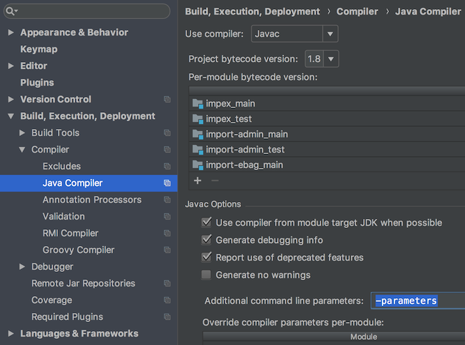 在 Compiler -> Java Compiler 中,设置 Additional command line parameters 为 -parameters:
